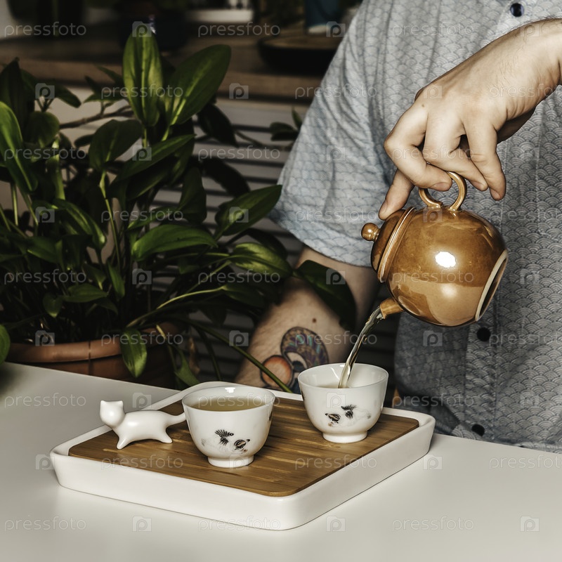 Наслаждайтесь изысканной чайной церемонией с элегантным чайником и красивыми чашками на декоративном подносе