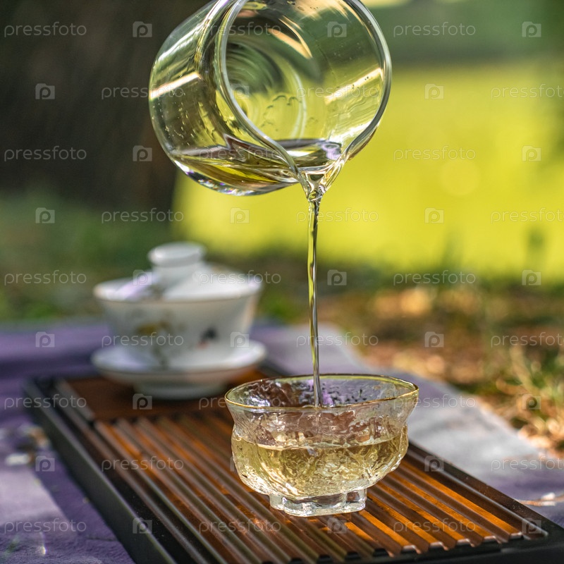 Спокойная сцена, когда чай наливают в хрупкую стеклянную посуду, окруженную красотой пышной живой зелени