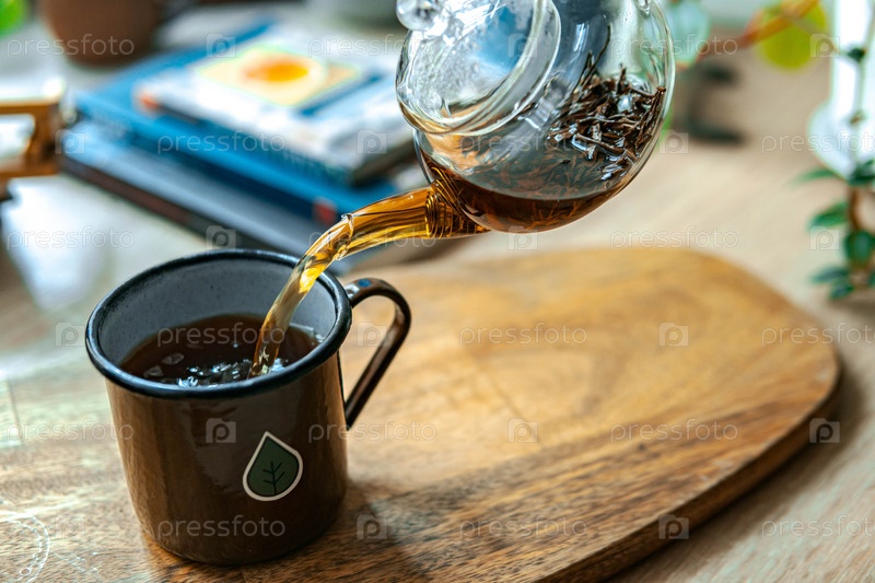 Настой вкусной чашки чая в красивую чашку, помещенную на полированной деревянной поверхности