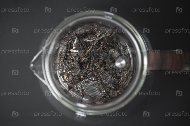 Детальное закрытие сушеного листа чая тщательно отображается в стеклянном сосуде для визуальной привлекательности