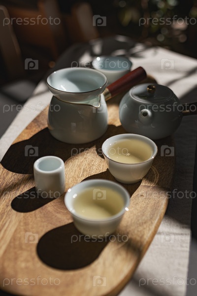 Спокойный чайной набор с потрясающим набором керамики и элегантных чашек, нежно освещенных мягким солнечным светом