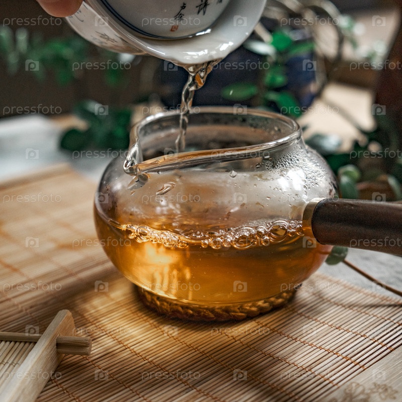 Чай наливают в красивый стеклянный чайник, высвобождая мягкий пар, который танцует над ним