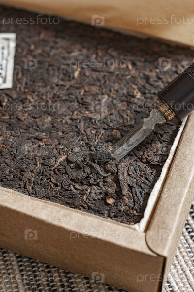 Закрытие красочного листового чая в специально разработанной коробке с небольшим ножом для подачи и наслаждения ароматами