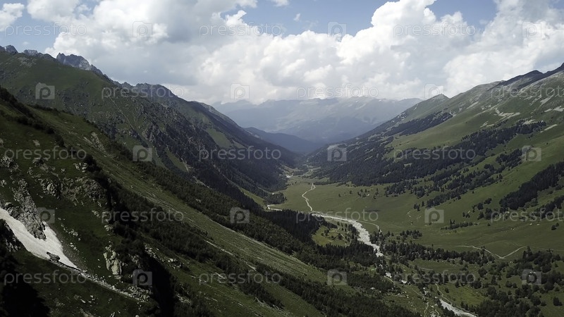 Летать над горами. Алтай, Сибирь. Лесная долина. Прекрасное небо с облаками