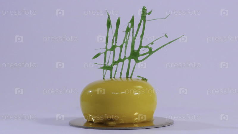 Современный желтый моссовый торт, украшенный зеленым карамелем на белом фоне