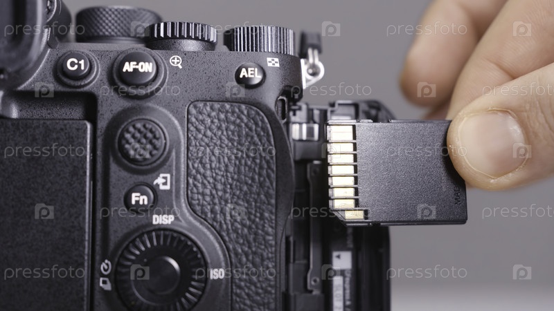Фотограф вставляет новую карту памяти в камеру.Замена карты памяти в камере