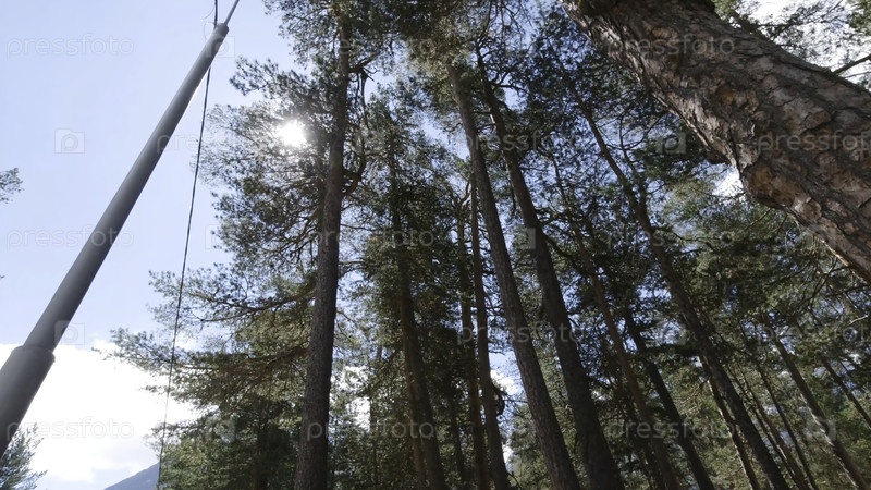 Вид снизу на высокие сосны на фоне яркого солнца и чистого неба. Клип. Прекрасный вид саженцев через глаза идущего в солнечный день. Сосновый лес с солнечным светом летом