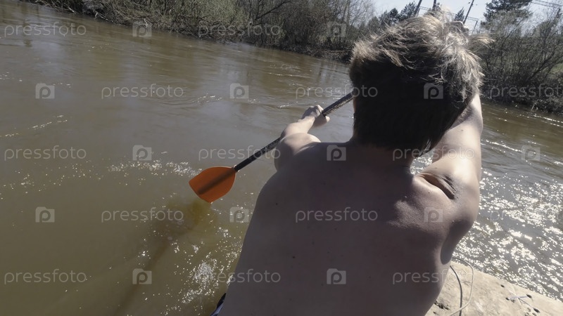 Клип.Два человека плавают на деревянном плоту с гребнями.Путешествие на древесном плоте по грязной реке весной