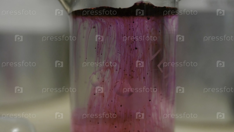 Красивая химическая реакция в колбе.Розовая или красная жидкость растворяется в колбе.Розовое вещество в колбе. Розовая или красная жидкость растворяется в колбе