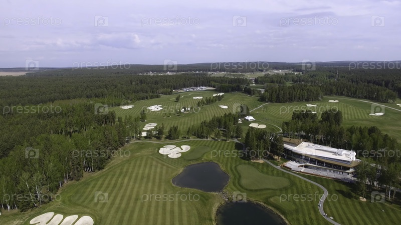 Солнечная тележка для гольфа с облаками в синем небе и лесным озером Гольф-клуб, воздух