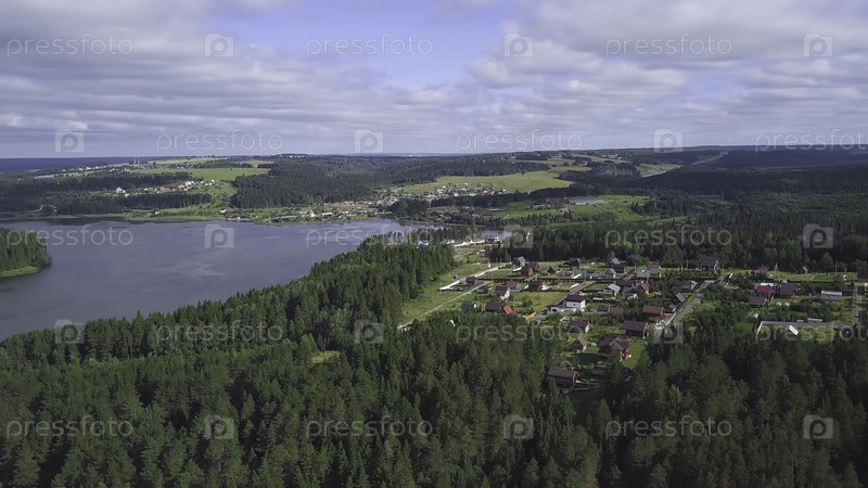 Вид на дома на берегу озера в лесу. Спокойствие и уединение. Отдых за пределами города. Коттежи с участками недалеко от города на озере в лесе