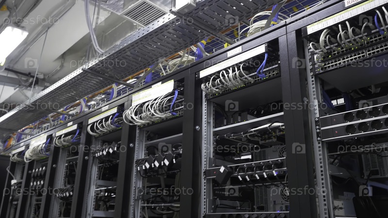Ряд биткойн-майнеров, установленных на проводной полке. компьютер для майнинга Биткойна. кабели подключены к материнской плате для машины добычи. криптовалютный компьютер со многими периферийными слотами