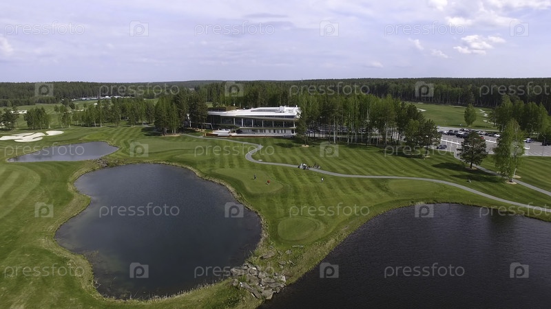 Поле для гольфа в солнечный день, отличный голф-клуб с прудами и зеленой травой, вид на небо
