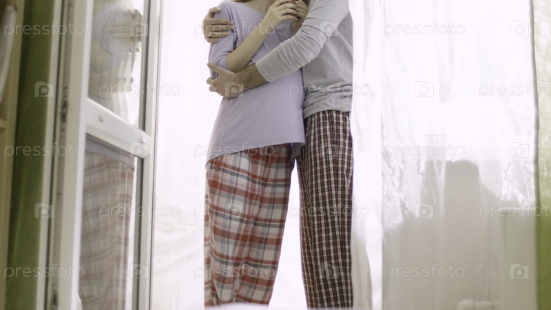 Любящий муж нежно обнимает свою беременную жену.Счастливая семья ждет рождения ребенка