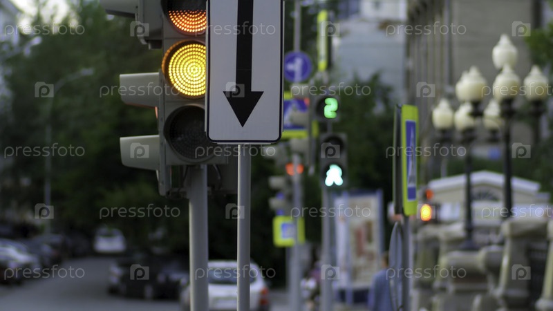 На оживленном пересечении в центре города. светофор, перекресток людей