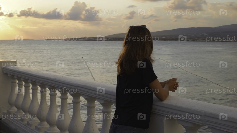 Женщина на берегу моря при закате солнца. СМИ. Молодая женщина стоит на периле среди морского пейзажа во время заката после дождя. Красивый ландшафт открывается привлекательной женщине набережной