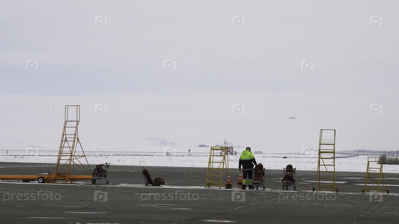 Пассажиры самолета приземляются на взлетно-посадочной полосе аэропорта на тёмном облачном фоне