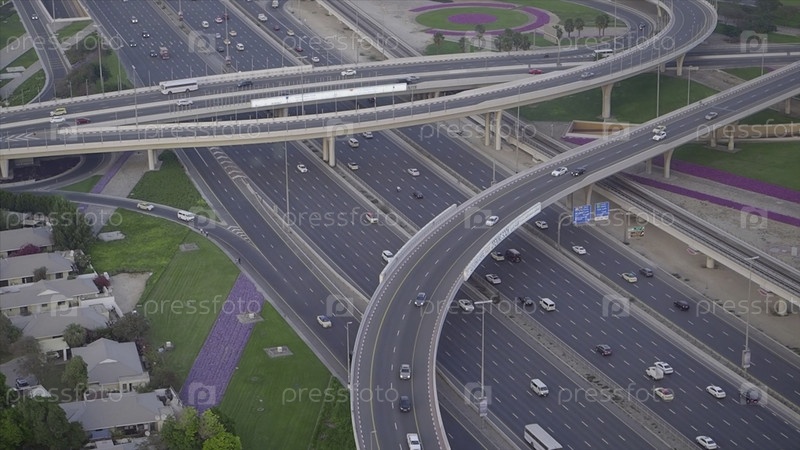 Вид сверху на городской трафик автомагистрали и моста.Сток.Вид на шоссе с автомобилями в Дубае