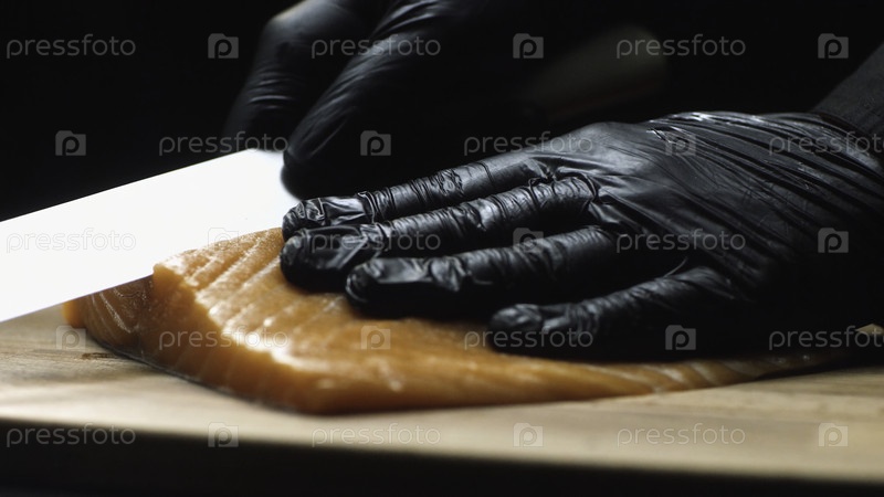 Профессиональный повар в черных перчатках держит кусок свежего лосося и готов разрезать его