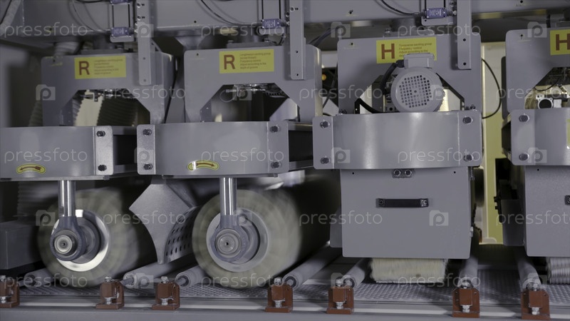 Промышленные машины с вращающимися щетками. продолжайте. вращающиеся шелковые сосуды разных размеров читают и красят деревянные доски на промышленном заводе