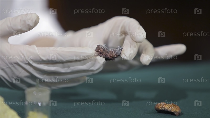 Ученый или археолог держит камни или минералы.Люди с археологическими образцами в руках