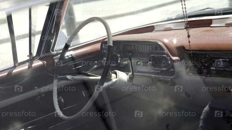 Дизайн интерьера классического американского автомобиля.Продолжайте.Вид на классический красный интерьер и приборную панель в отличном состоянии