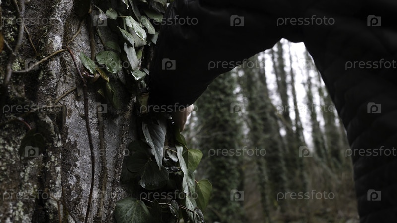 Человек прикоснулся к дереву, покрытому плющом, когда он пробивался через лес на холме с другом, потерявшимся в лесу