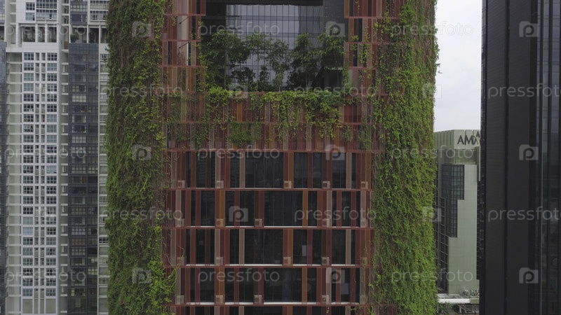 Вид на отель Оазия в Сингапуре во второй половине дня. Гостиница в Сингапуре с отелем Oasia. Подвесные сады на здании в Сингапуре