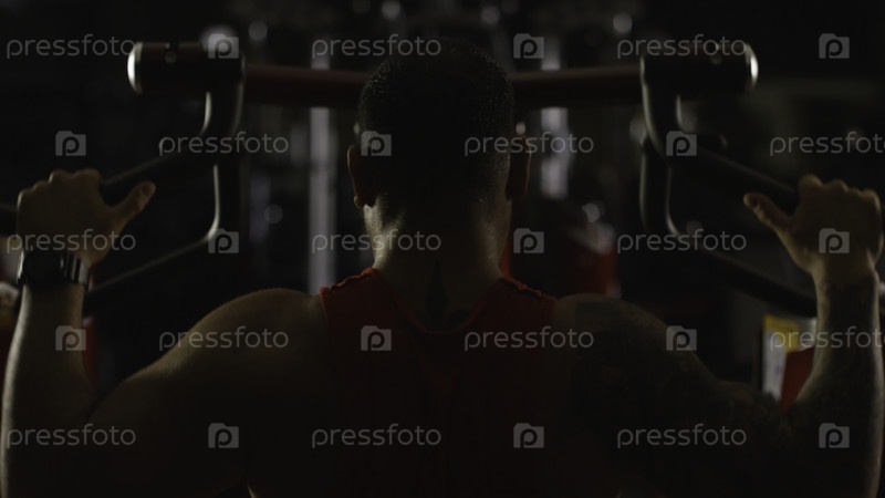 Спортсмен бодибилдер тренируется в тренажерном зале. Красивая мускулистая спортсменка в фитнес-клубе, вид сверху. Боец 4K