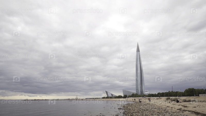 Вид с пляжа на голубой небоскреб против облачного неба осенью. идите вперед. оживленный пляж возле города с небоскребами в пасмурную погоду. красивый пляж рядом с многоэтажными домами осенью