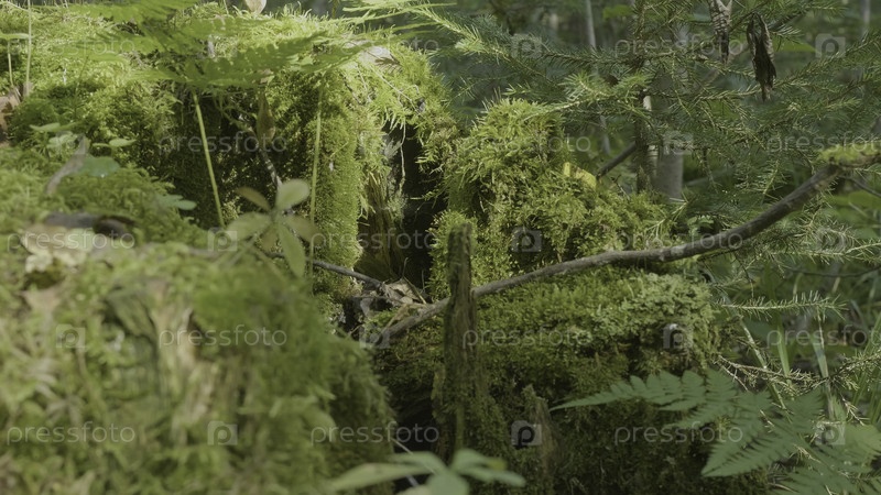Старый ствол дерева, покрытый мхом в хвойном лесу, красивый пейзаж