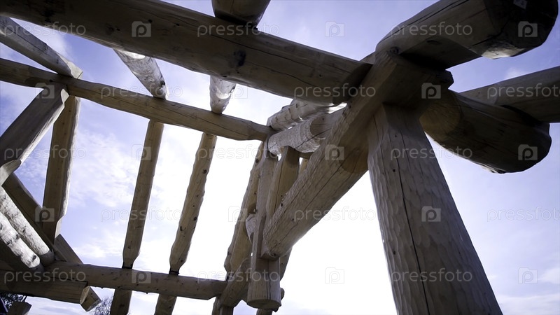 Каркас деревянного загородного дома, построенного из бревен. Клип. Строительство бревенчатого дома в начале строительства на фоне голубого неба