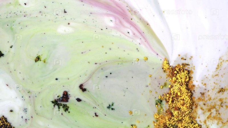 Близкий план цветной порошковой краски на воде. Абстрактный художественный рисунок пятен пылевой краски на белой жидкости. Красивая цветовая настойка цветов на воде