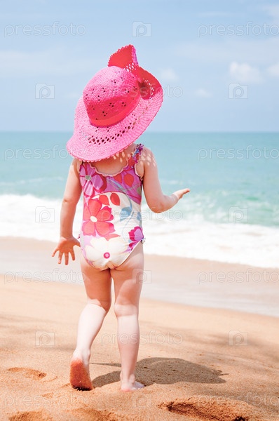 Девочка в розовой шляпе и купальнике на берегу моря