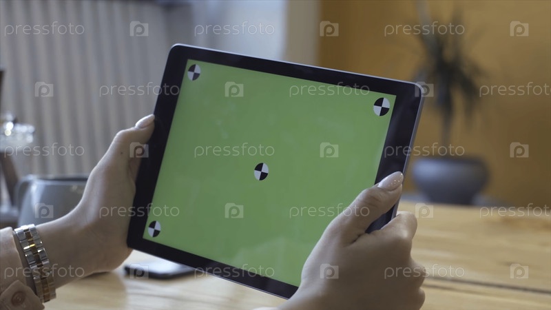 Молодая женщина сидит за столом и смотрит на планшетный компьютер с зеленым экраном