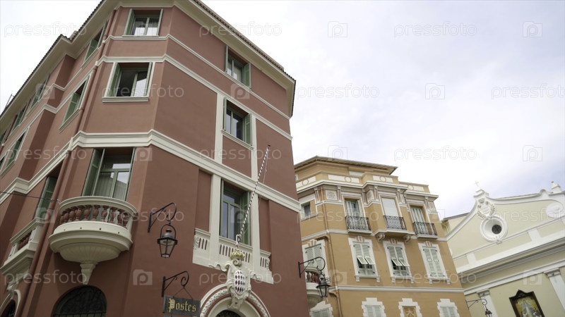Красивые красочные дома в европейском стиле. Идите дальше. Дома туристического городка с яркой краской и небольшими балконами выходят на улицу. Прекрасная архитектура домов против неба