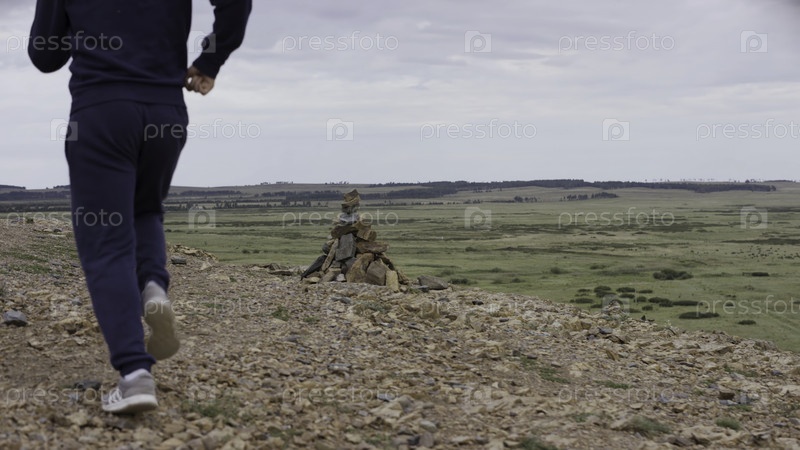 Кросс-кантри.Близость мужских ног проходит через скалистую местность.Мужчина бежит по горам