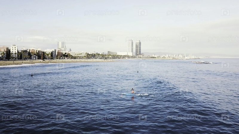 Сёрфер качается и плавает на доске, разрывая волны океана.Сток.Вид человека, едущего на доске по волнам