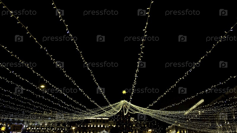 Яркие сверкающие украшения праздничного новогоднего города ночью.Концепция.Светящие декорации с гирляндами освещают ночной город и создают праздничное настроение на Новый год