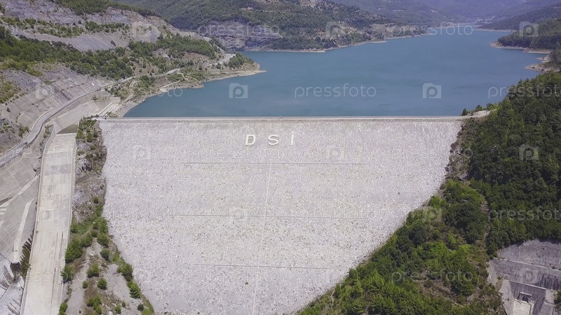 Снимок. Вид на большую дамбу, удерживающую воду в горах. Бирюзовая вода в резервуаре с большой плотиной. Огромная плотина в Турции