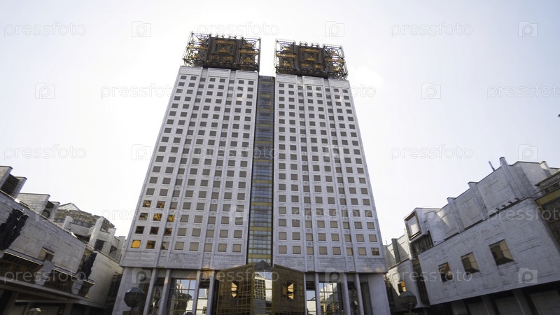 Здание РАН в Москве. Идите дальше. Нижний вид необычной архитектуры советского модернизма. Комплекс зданий Президиума Российской академии наук. Красивые архитектурные достопримечательности Москвы