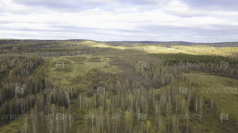 Вид с воздуха, осенний пейзаж дикого леса. Клип. Высокоугольный вид дороги через осенний лес