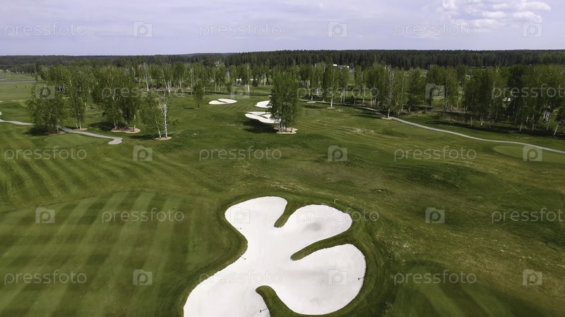 Вид с воздуха на поле для гольфа, песчаные бункеры на прекрасном поле
