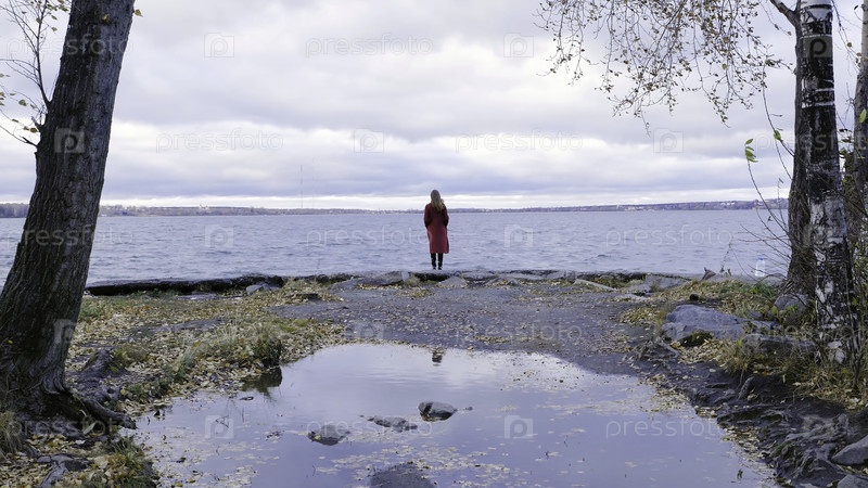 Молодая девушка с волосами стоит возле воды в холодное время года.Разгляд назад.Молодая женщина стоит на берегу озера.Тихий и уютный вечер