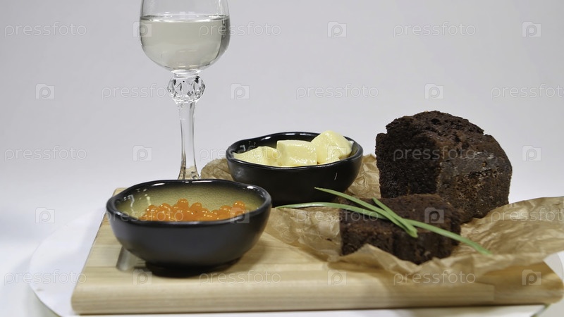 Свежая красная икра с базиликом и маслом на хлебе в студии. Она разводится из красной икры со стаканами вина на заднем плане. Холодная русская водка с льдом и небольшие бутерброды-перекусы с маслом и рыжей лососевой икрой на старом деревянном столе в руст