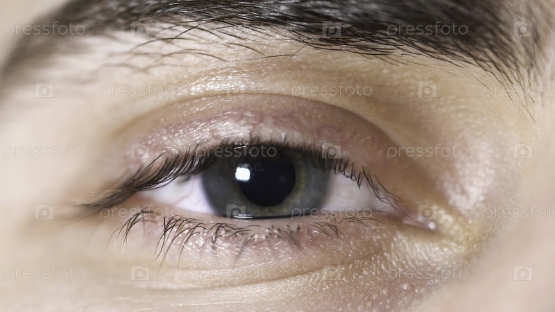 Закрытие человеческих глаз. Красивое лицо молодого человека с сокращающейся от света зрачкой. Человеческое око серое и коричневое с привлекательными бровями и ресницами