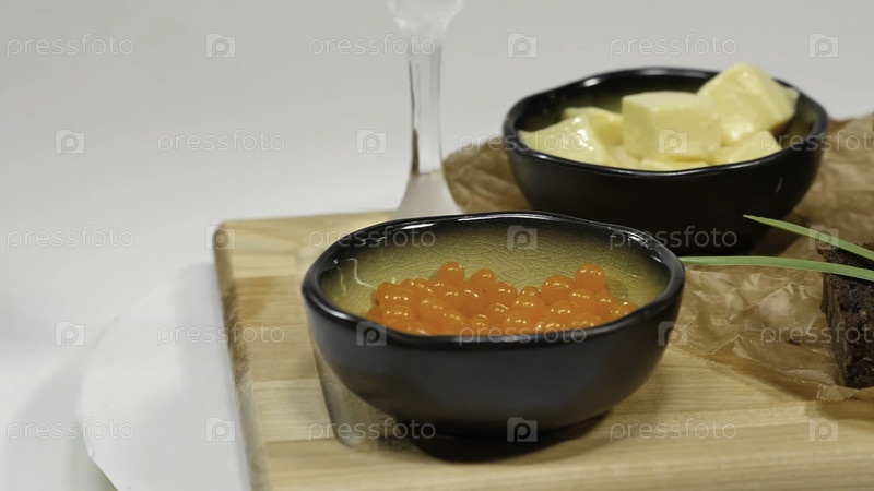 Масло, икра, черный хлеб. миска красной икры со ложкой подается с нарезанным хлебом, маслом и травами на белом фоне. цельнозерновый хлеб, масло и красная иквария, белый фон 4K