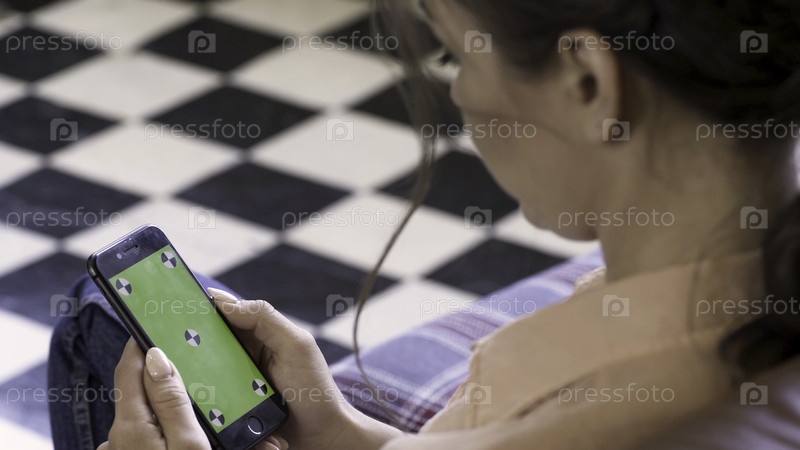 Красивая женщина держит мобильный телефон с зеленым экраном и отслеживает следы в своих руках на квадратном фоне пола. резервная запись. Женщина держит мобильный смартфон с хромированным ключом