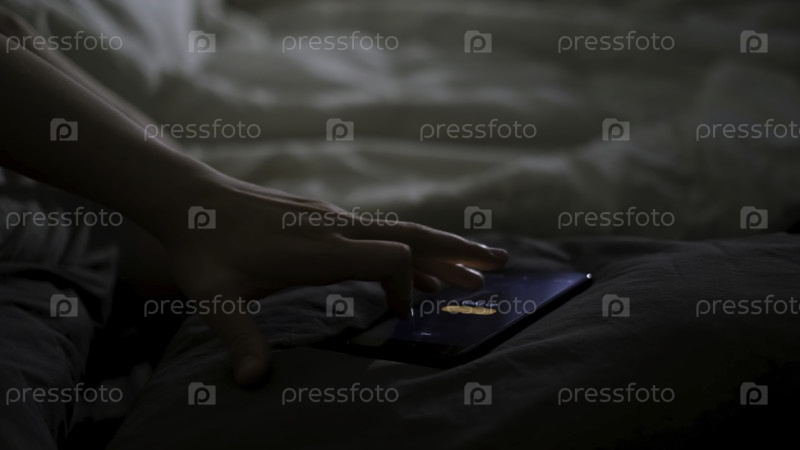 Спящий человек просыпается от телефона, лежащего на кровати.Концепция.Рука мужчины пытается выключить будильник, лежащий рядом с одеялом дома рано утром