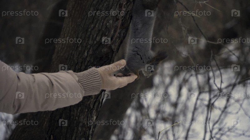 Красивые пушистые белки закрываются в осеннем парке и едят орехи. Белка ест орехи непосредственно из рук молодой девушки. Белка ест из рук мужчины в парке. Закрытие